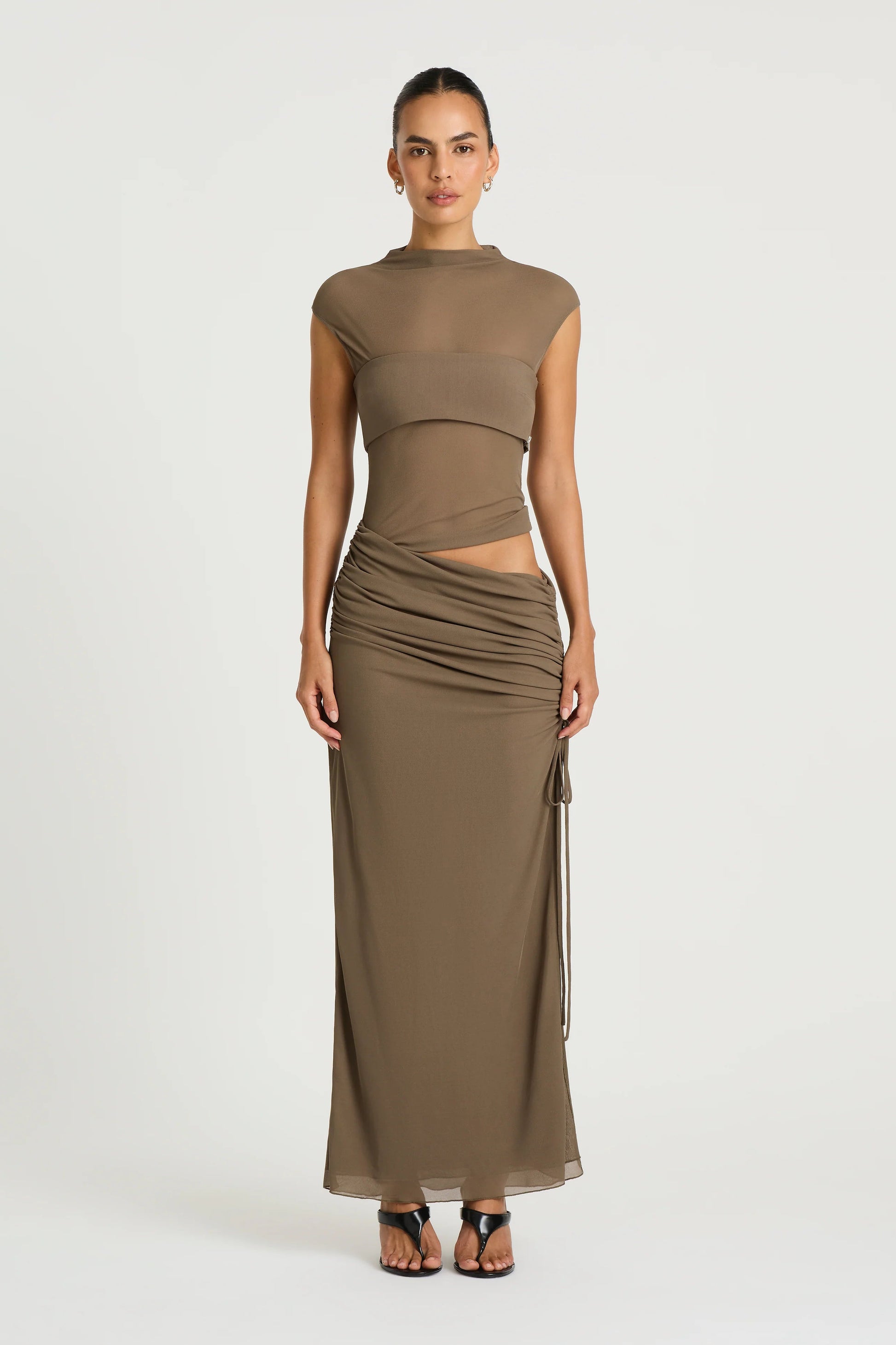 The ruched skirt with adjustable side tie creates a flattering silhouette, while the earthy khaki tone adds a modern, sophisticated edge. Perfect for weddings, cocktail parties, birthday celebrations and formal events, this piece transitions seamlessly from day to night.