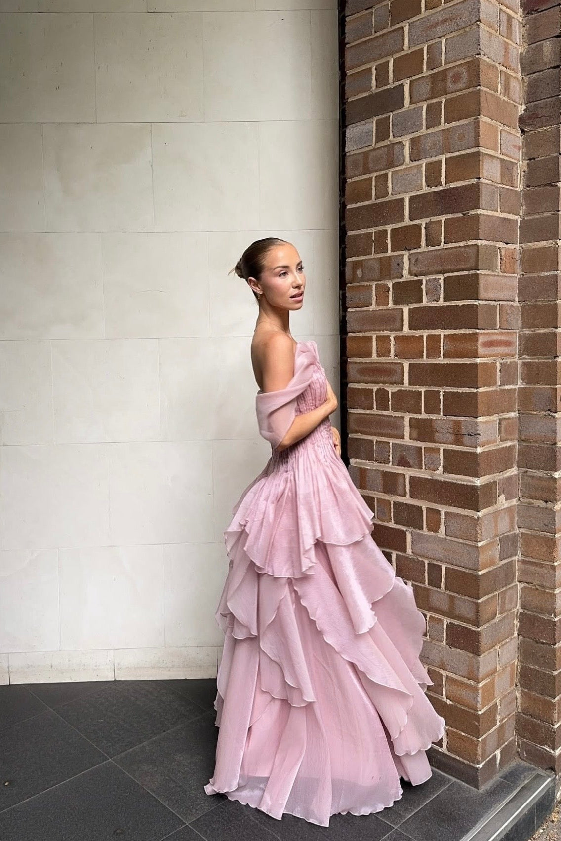A romantic strapless gown in a soft fawn pink hue, designed to create a dramatic yet feminine silhouette. Featuring a textured, sculpted bodice with delicate gathering and voluminous off-shoulder sleeves, this piece cinches through the waist before cascading into layered ruffles throughout the skirt.